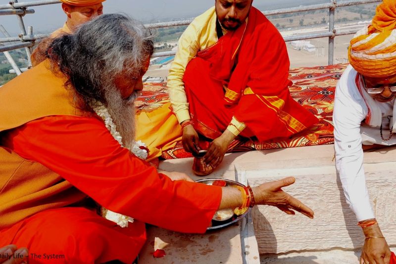 On 16 February, the fifth golden Kalash was lifted onto the big Samran (the temple dome above Holy Guruji's Samadhi) and the largest Kalash dedicated by Vishwaguruji, was installed on the Sikhar (top of the Shiva Lingam Mandir), together with the Dayadanda (golden flag) on 17 February.